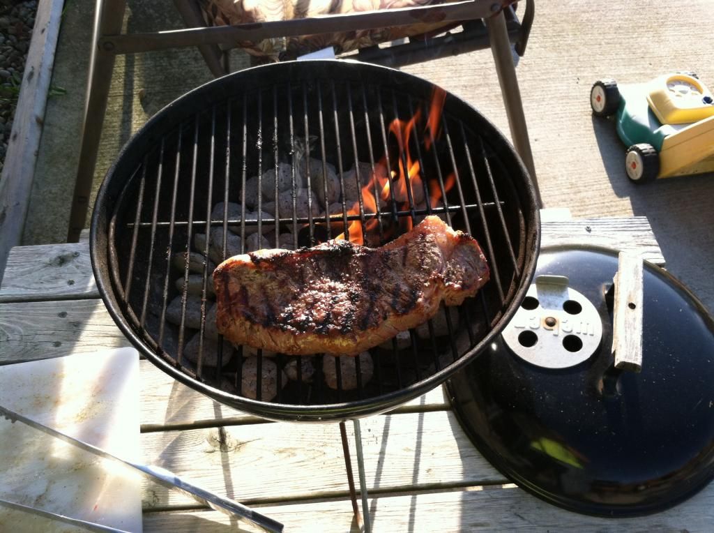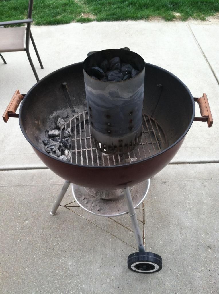 Pork shoulder are fatty and full of fibrous connective tissues, so you have to cook them over a long period of time, you want to make sure to keep the heat low and cook it slow. Cooking it low and slow ensures the fat and the fibrous tissues melt to make it tender and juicy. Anyway, to cook it slow I took 12 briquettes out of charcoal ring and lit them using my compact chimney. Once they were lit and ashed over, I dumped them into the middle of the charcoal ring to get it going. I put the middle section on and filled the water pan with hot water. In a vertical smoker, the water pan is directly above the charcoal. The water pan lets the food be cooked indirectly. When it is full of water, it acts like a heat sink and keeps the temperature low in the smoker. Plus the steam from the water boiling off keeps the food moist. I was able to get the shoulders on the smoker right at midnight just in time for WSM Smoke Day.
