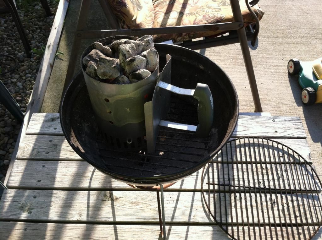 I set up the smoker by putting some charcoal in the ring, added a couple of pieces of cherry smoke wood, filled the ring to the top with more charcoal and then I added a few more pieces of cherry wood.